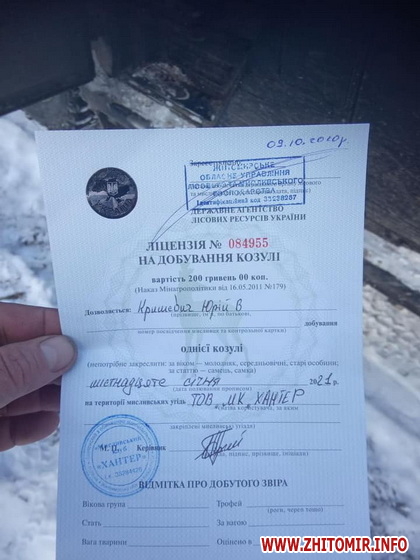 Виявлена екологами ліцензія, видана МК «Хантер» на полювання козулі саме 16 січня 2021 року