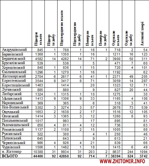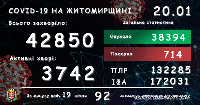 Станом на 9:00 год. 20 січня 2021 року в Житомирській області лабораторно підтвердили 42850 випадків коронавірусної хвороби. За минулу добу, 19 січня, обласний лабораторний центр зробив 373 ПЛР-тести та підтвердив 92 нові випадки COVID-19. За період пандемії від ускладнень хвороби померли 714 пацієнтів, у тому числі семеро – минулої доби. Одужало загалом 38394 особи.
