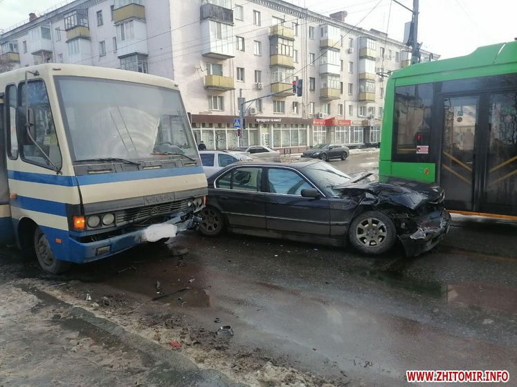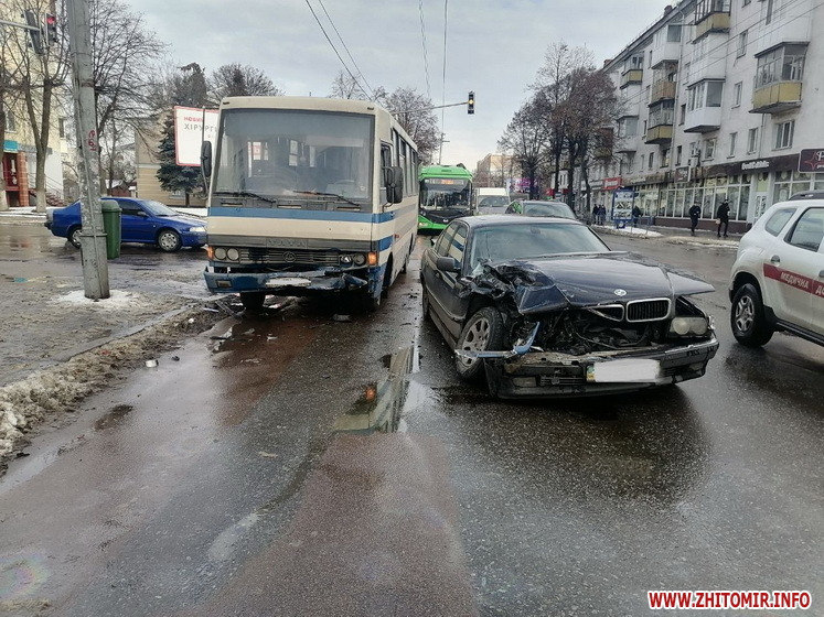 У Житомирі на вулиці Київській 22 січня зіштовхнулись маршрутний автобус «Київ-Житомир» та легковик. Двоє людей отримали травми.