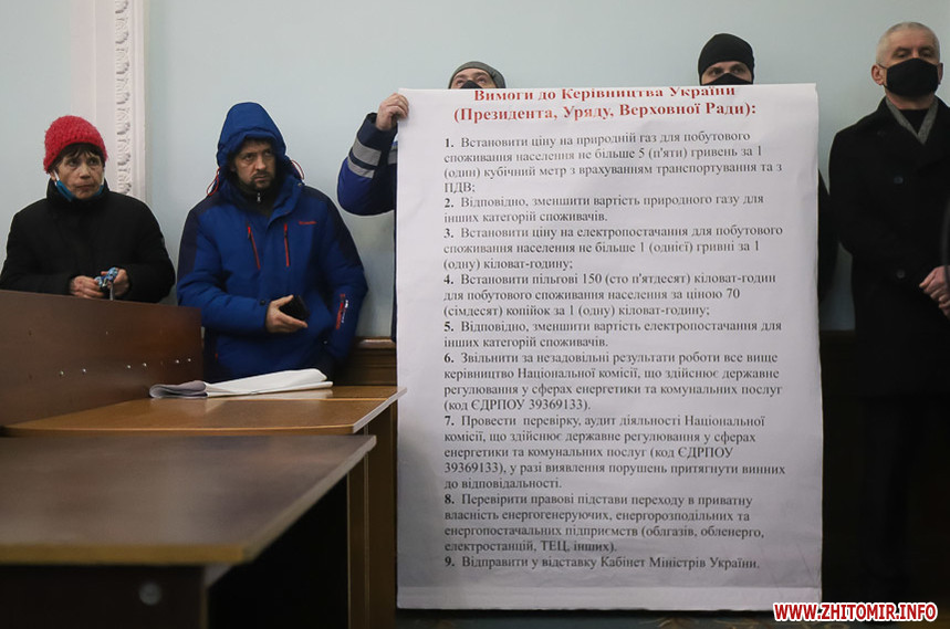 21 січня під стінами Житомирської міської ради вкотре пройшов мітинг проти підвищення тарифів. Того разу список вимог протестувальників поповнився такими пунктами: скасувати часові обмеження для пенсіонерів у громадському транспорті, провести публічний аудит в КП «Житомирводоканал», КП «Житомирське трамвайно-тролейбусне управління» та публічну перевірку в КП «Житомиртеплокомуненерго», а також відправити у відставку Кабмін та звільнити керівництво НКРЕКП.