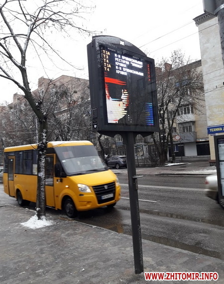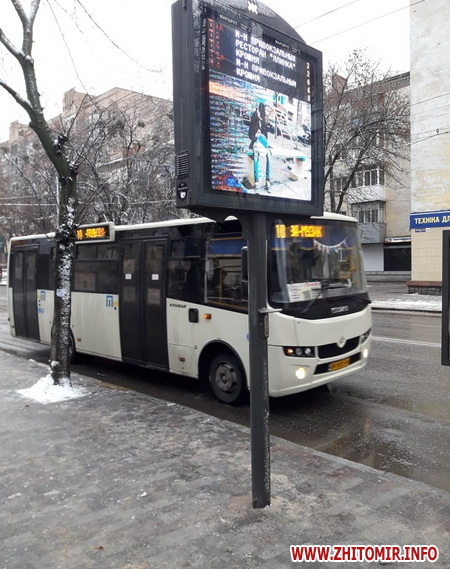 У Житомирі на зупинках громадського транспорту працюють електронні табло прогнозування, проте станом на 26 січня на них відображається лише інформація по міських тролейбусах, жодних даних про прибуття на зупинку маршрутного транспорту на них немає. Не вдається відслідкувати маршрутки і в онлайн-додатку DozoR.