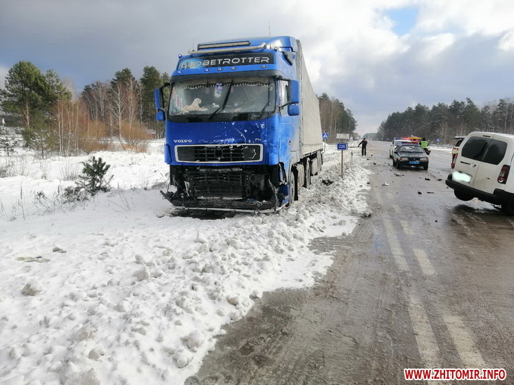 Пресофіцер патрульної поліції Житомирської області Тетяна Носадчук у коментарі Житомир.info повідомила, що, за попередньою інформацією, внаслідок зіткнення вантажівки Volvo та фургона Peugeot травмувалися двоє людей – водій і пасажирка Peugeot. Постраждалі були госпіталізовані до Олевської районної лікарні.