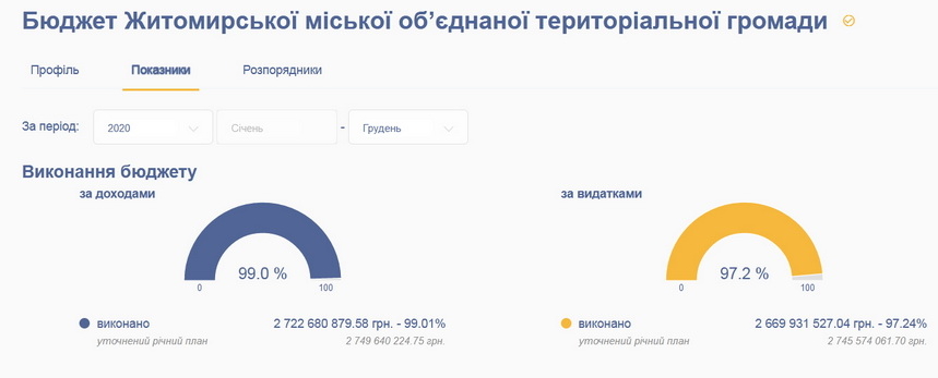 Бюджет Житомирської міської об’єднаної територіальної громади у 2020 році отримав 99,01% від запланованих доходів, що становило 2 млрд 722 млн 680 тис. 879.58 грн, а видатки були виконані на 97,24%.