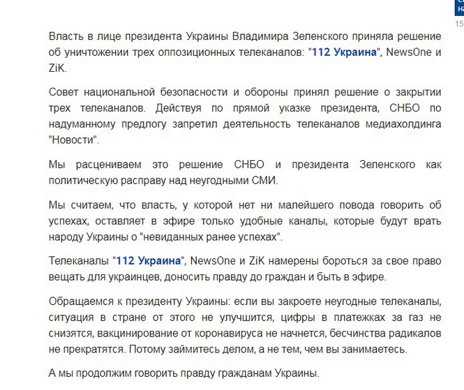 Пізно ввечері на сайті «112 Україна» опублікували заяву заблокованих телеканалів, рішення РНБО називають «решением об уничтожении трех оппозиционных телеканалов» та «политической расправой над неугодными СМИ».