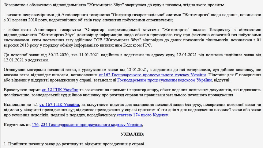 Господарський суд Житомирської області відкрив провадження у справі ухвалою від 14 січня 2021 року.