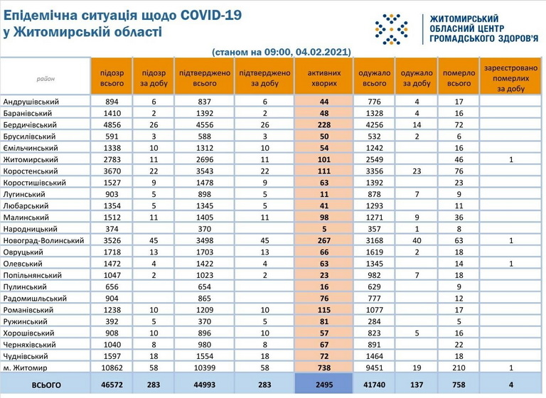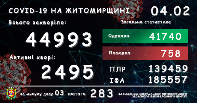 Станом на 09:00 год. 4 лютого 2021 року в Житомирській області лабораторно підтвердили 44993 випадки коронавірусної хвороби. За минулу добу, 3 лютого, зареєстрували 283 нові випадки. За період пандемії від ускладнень COVID-19 померло 758 людей, у тому числі минулої доби зафіксували 4 летальні випадки. Одужало загалом 41740 пацієнтів.