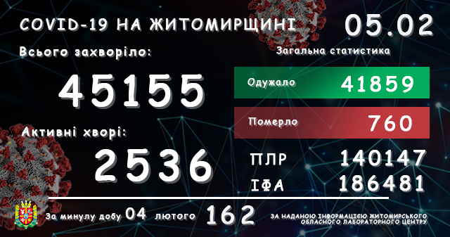 Станом на 09:00 год. 5 лютого 2021 року в Житомирській області лабораторно підтвердили 45155 випадків коронавірусної хвороби. За минулу добу, 4 лютого, зареєстрували 162 нові випадки. За період пандемії від ускладнень COVID-19 померло 760 людей, у тому числі минулої доби зафіксували 2 летальні випадки. Одужало загалом 41859 пацієнтів.