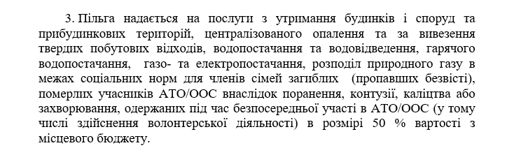 У даному положенні передбачається надання пільги у розмірі 50% від плати за послуги з утримання будинків, централізованого опалення, вивезення сміття, водопостачання і водовідведення, електропостачання, газопостачання. Відмінність від попередньої редакції положення полягає у тому, що до переліку додали компенсацію (50%) плати за розподіл газу.