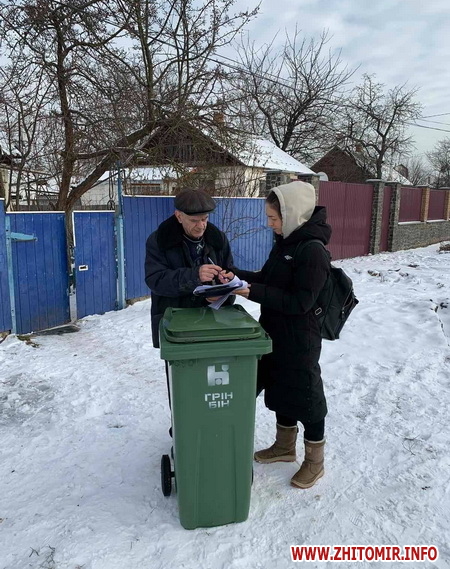 «Управління житлового господарства міської ради повідомляє, що в рамках розпорядження міського голови від 13.03.2020 № 256 «Про створення рейдової групи з контролю за укладенням мешканцями Житомирської міської об’єднаної територіальної громади договорів на вивезення твердих побутових відходів», сьогодні 02.02.2021 було проведено відпрацювання території, щодо заключення договорів на вивезення ТПВ по частині вул. Миколи Сціборського, провулків 1-й та 2-й Капітульний. Водночас представниками підприємства-перевізника ТОВ «Грін Бін Україна» здійснювалось укладення договорів на користування індивідуальними контейнерами, які компанія готова розповсюдити по всім домогосподарствам, які розташовані на території приватно-садибної забудови, де ТОВ «Грін Бін Україна» визначено надавачем послуги. Всього за 3 години спільної роботи, мешканці отримали майже 50 пластикових 120 літрових індивідуальних контейнерів, що у майбутньому призведе до поліпшення санітарного стану території вулиць та провулків, де немає можливості для встановлення сміттєзбірних майданчиків для збору ТПВ», - йдеться в повідомленні управління житлового господарства.