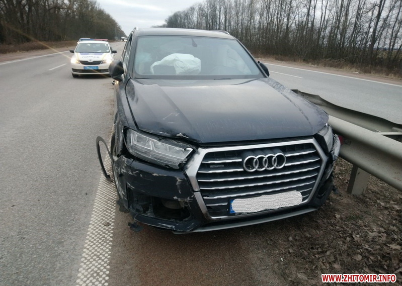«По прибутті на місце події патрульні поліцейські встановили, що зіштовхнулись транспортні засоби Audi Q7 та Hyundai Accent. Hyundai злетів з дороги та врізався в дерево. Водійка Hyundai отримала тілесні ушкодження та була госпіталізована до Брусилівської лікарні. Забезпечено охорону місця події та безпеку дорожнього руху. На місці працює СОГ», – зазначила пресофіцерка патрульної поліції Тетяна Носадчук.