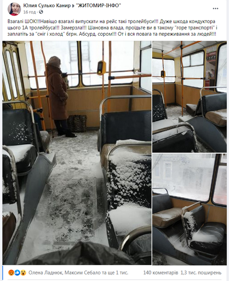 «Взагалі шок! Навіщо взагалі випускати на рейс такі тролейбуси! Дуже шкода кондуктора цього 1А тролейбуса! Замерзла!», – йдеться у дописі Юлії Сулько.