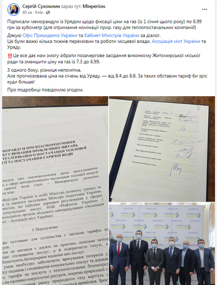 «Підписали меморандум із Урядом щодо фіксації ціни на газ (із 1 січня цього року) по 6,99 грн за кубометр (для отримання номінації прир. газу для теплопостачальних компаній). Це все дає нам змогу зібрати позачергове засідання виконкому Житомирської міської ради та зменшити ціну на газ із 7.3 до 6.99. З одного боку, різниця непомітна. Але прогнозована ціна на січень від Уряду, — від 8.4 до 8.8. За таких обставин тариф би зріс куди більше! Про подробиці повідомлю згодом», – написав мер.