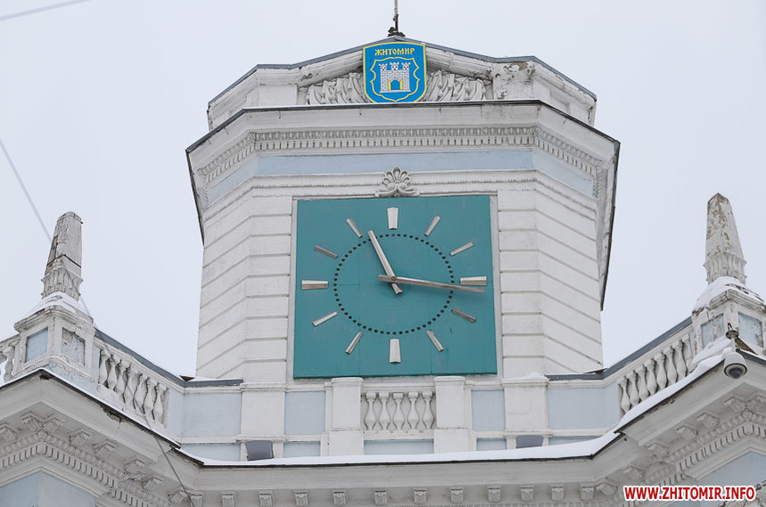Годинник на ратуші Житомирської міської ради 9 лютого тимчасово зупиняли. І хоча він вже знову працює, у багатьох виникло запитання, чи не зламався він. У міськраді пояснили, що годинник зупинили тимчасово на профілактику, бо під час хуртовини та морозу механізм трохи примерз, тому потрібно було все перевірити.