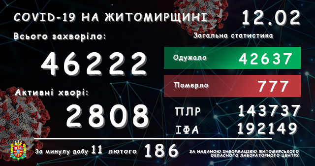 Станом на 09:00 год. 12 лютого 2021 року в Житомирській області лабораторно підтвердили 46222 випадків коронавірусної хвороби. За минулу добу, 11 лютого, зареєстрували 186 нових випадків. За період пандемії від ускладнень хвороби померли 777 пацієнтів, у тому числі минулої доби зафіксували три летальні випадки. Одужало загалом 42637 осіб.