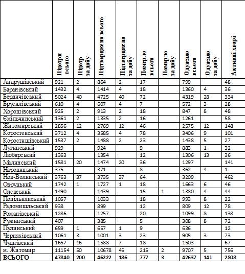 у лікарнях, які внесені до переліку закладів охорони здоров`я, що визначені для госпіталізації пацієнтів з гострою респіраторною хворобою COVID-19, спричиненою коронавірусом SARS-CoV-2, – всього 2525 ліжок, забезпечено ліжок киснем — 2225, визначених для госпіталізації пацієнтів з підтвердженим випадком COVID-19, з яких зайнято 484 хворими на COVID-19 та 143– пацієнтами з підозрою на COVID-19 (23,34% від загальної кількості ліжок);