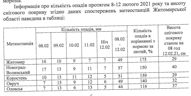 «У зв’язку із переміщенням на територію України серії південних циклонів, протягом 8-12 лютого 2021 року на Житомирщині виникли складні погодні умови: щодоби випадав значний сніг, сформувався та швидко збільшився сніговий покрив, на автошляхах області утворився сніговий накат та ожеледиця. Періодичне посилення вітру до 10-14 м/с спричинило хуртовини та снігові замети. Температура повітря коливалась в межах слабких та помірних морозів», - йдеться у повідомленні обласного центру з гідрометеорології.