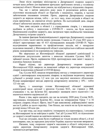 «У разі виявлення порушень та недоліків, що призвели у Житомирській області, у тому числі, до загострення ситуації з пандемією COVI-19, звернутися до Житомирської обласної державної адміністрації з вимогою звільнити Суслика М.П. із займаної посади», - просять автори запиту.