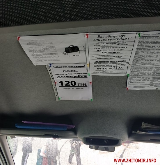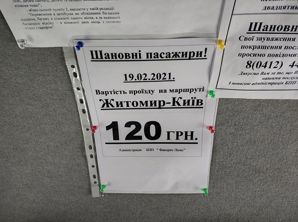Оголошення про це пасажири помітили у маршрутці Mercedes Sprinter, що вдень 13 лютого відправлялася із центрального залізничного вокзалу в Києві. Про подорожчання ціни на проїзд пасажирів попереджає перевізник «Фаворит-Люкс».
