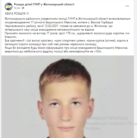 «Житомирським районним управлінням поліції ГУНП в Житомирській області встановлюється місце знаходження 17-річного Башинського Максима, жителя с. Велика Горбаша Черняхівського району, який 12.02.2021 поїхав на навчання до м. Житомир і до теперішнього часу місце знаходження неповнолітнього невідоме», – йдеться у повідомленні.