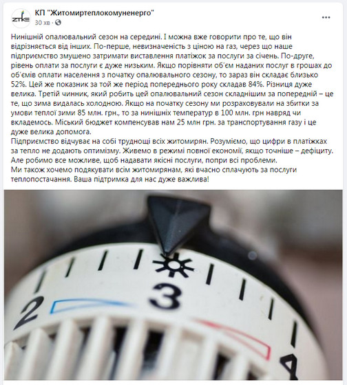 Скріншот Facebook-допису КП «Житомиртеплокомуненерго»