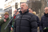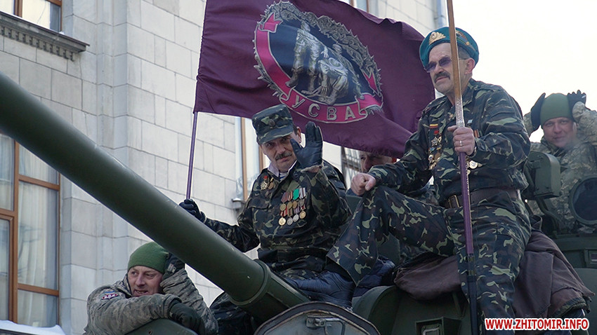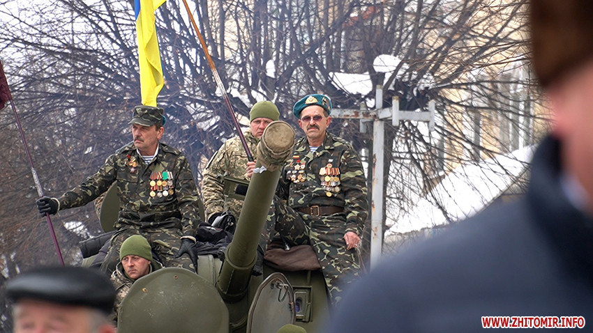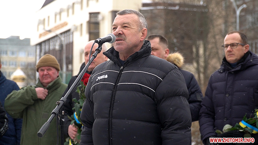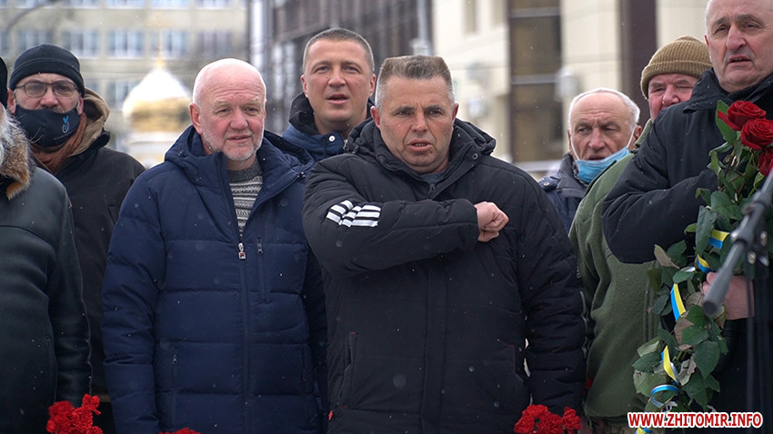 «32-а річниця. Мало це чи багато? Я думаю, що це наш шлях з тієї війни. За ці роки ми не розпорошились, ми залишаємось єдиною в державі, в Україні, в області, в Житомирі організацією. Ми єднаємось, одним словом: «Афган», «шураві», «бача» – ці всі поняття для нас дуже близькі. Кожне 15 лютого для нас – це як новий рік. Ми живемо з вами від 15 лютого до 15 лютого. І дай Боже, щоб ми з вами були цілісними, єдиними, однодумцями і підтримували одне одного. Сьогодні важкі часи у нас на сході України. Вчора, на жаль, три «двохсотих». Кому, як не нам, розуміти, що таке «двохсотий». Це не дуже приємний «подарунок» для матерів, для батьків. Цю війну треба закінчувати, і закінчувати якомога раніше. Наша війна в минулому столітті була найдовшою. Десятилітня війна. Ми всі пам’ятаємо, як десять років ми не могли дочекатись, коли закінчиться війна. А наші матері все думали: заберуть сина, чи не заберуть, привезуть його в цинку, чи не привезуть. Та війна закінчилась, так, і цю треба закінчувати. Я розумію, що сьогодні це не свято, це для нас мірило прожитого року і шлях у майбутнє. Єднаймось, шануймо одне одного і слава Україні», – сказав голова Житомирської міської спілки ветеранів Афганської війни Юрій Панасюк.