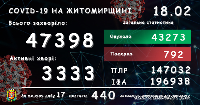 Станом на 09:00 год. 18 лютого 2021 року в Житомирській області лабораторно підтвердили 47398 випадків коронавірусної хвороби. За минулу добу, 17 лютого, зареєстрували 440 нових випадків. За період пандемії від ускладнень хвороби померли 792 пацієнтів, у тому числі минулої доби зафіксували три летальні випадки. Одужало загалом 43273 людини.