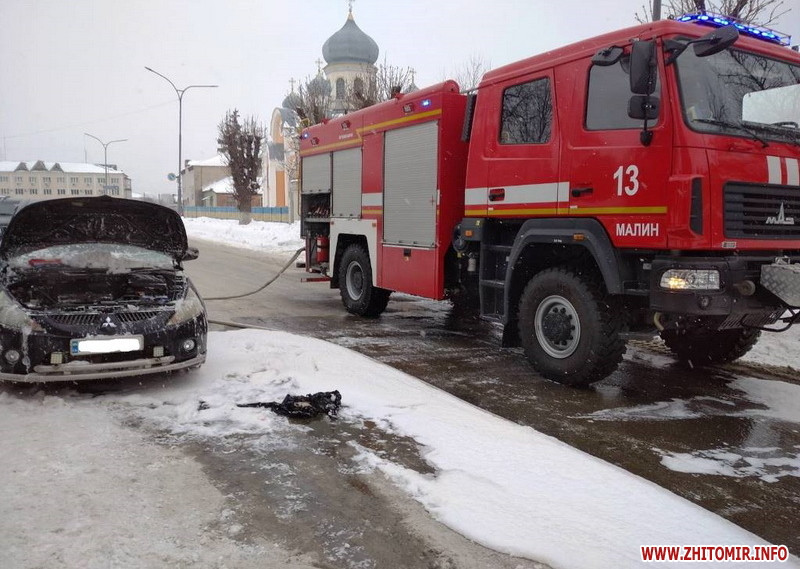 «18 лютого о 08:03 до Служби порятунку «101» надійшло повідомлення про те, що на центральній площі м. Малин горить автомобіль «Mitsubishi». Про це рятувальників сповістили очевидці. По прибуттю вогнеборців до місця виклику з-під капота двигуна йшов густий дим та виднівся вогонь. В салоні легковика нікого не було. Менш як 5 хвилин знадобилось бійцям ДСНС для ліквідації пожежі. Вогонь устиг лише пошкодити відсік двигуна. Автівка стояла далеко від найближчих транспортних засобів, тому загрози перекидання полум’я не було», - йдеться у повідомленні.