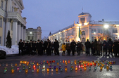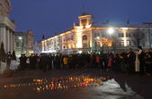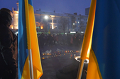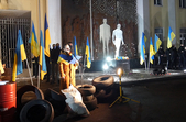 На майдані Корольова перед будівлею ОДА поклали шини та запалили вогнища у бочках – як символ місць для обігріву «майданівців». Навпроти пам’ятного знаку Героям Небесної Сотні виклали лампадки у вигляді тризуба.