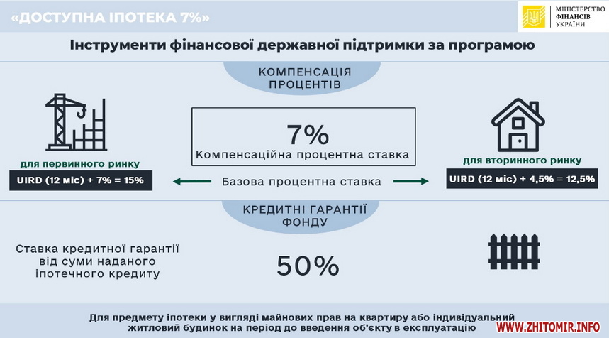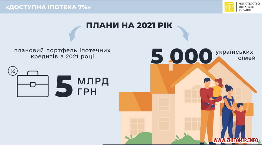 «Програма «Доступна іпотека 7%» надає можливість людям з відносно невисоким рівнем доходу отримувати житло в кредит з частковою компенсацією відсотків державою. Близько 5000 сімей зможуть скористатися Програмою у 2021 році. Плановий портфель іпотечних кредитів у цьому році складає 5 млрд грн. Запуск програми запланований на 1 березня 2021 року і є першим кроком у реалізації загальної стратегії відновлення іпотечного ринку в Україні», – повідомив міністр.