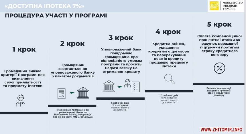 «Важливо зазначити, що механізм реалізації програми передбачає часткову компенсацію відсотків за іпотечними кредитами з боку держави до максимально сприятливі для людей 7% річних. Також передбачено можливість використання кредитних гарантій Фонду в якості забезпечення для предметів іпотеки, що ще не введенні в експлуатацію. Для отримання іпотеки громадянин має звернутися до уповноваженого банку зі стандартним пакетом документів, що підтверджують його дієздатність, платоспроможність та відповідність іншим критеріям Програми. Уповноважений банк заключає договір та подає дані до Фонду (реєстр) для подальшої компенсації відсотків між компенсаційною та базовою процентними ставками, використовуючи авансування з ескроу рахунків», - інформує Мінфін.