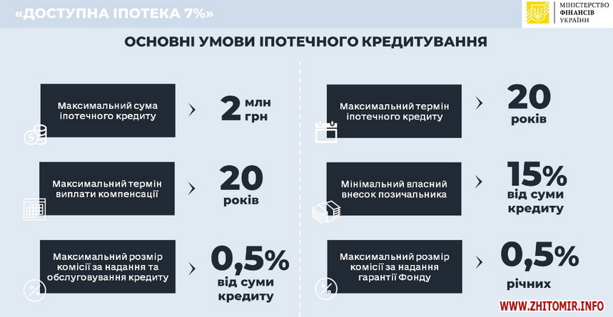 За умовами програми кредит можна буде отримати строком до 20 років, із мінімальним першим внеском 15% вартості предмету іпотеки. Максимальний розмір комісії за надання та обслуговування кредиту складає 0,5 від суми кредиту та додатково 0,5 % річних за гарантії Фонду у випадку використання.