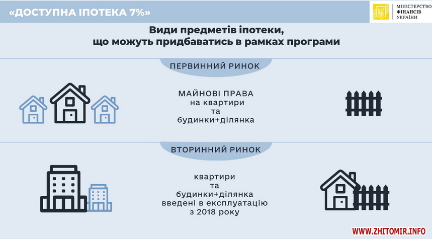 Предмет іпотеки – це квартири та індивідуальні житлові будинки (разом із земельною ділянкою) на первинному та вторинному ринку, введенні в експлуатацію з 2018 року.