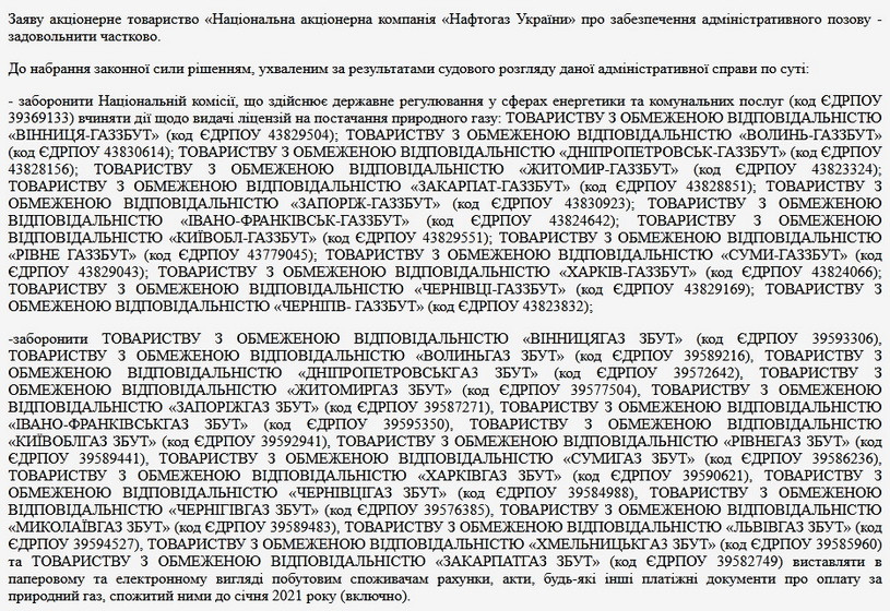 Зазначимо, що суд не задовольнив деякі вимоги «Нафтогаз України» щодо забезпечення позову, які стосувалися заборони розпоряджатися грошовими коштами, отриманими та такими, що можуть бути отримані у майбутньому від побутових споживачів за природний газ, спожитий ними до січня 2021 року (включно); вчиняти правочини, предметом яких є відступлення права вимоги до побутових споживачів; отримувати грошові кошти від побутових споживачів в рахунок оплати заборгованості за природний газ, спожитий ними до січня 2021 року (включно).