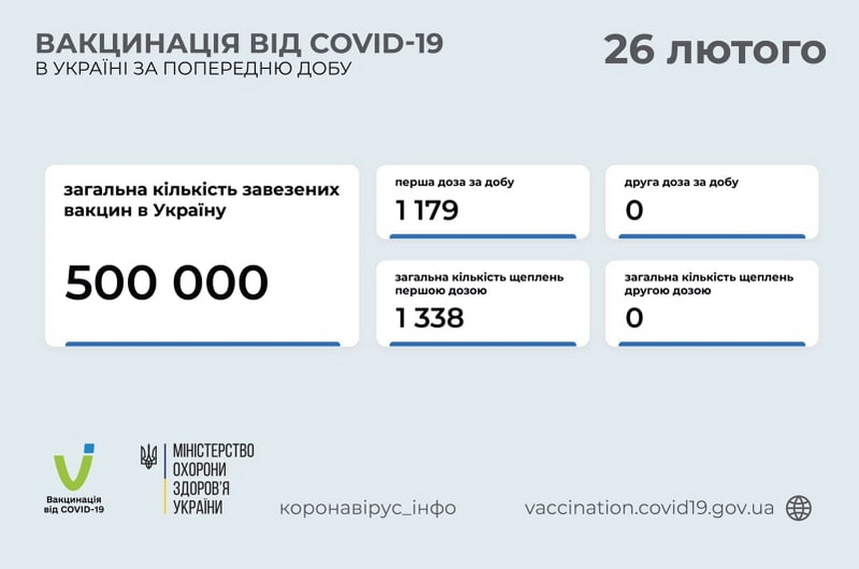 «1179 осіб щеплено проти COVID-19 за добу 25 лютого 2021 року в Україні. Від початку кампанії щеплено 1338 осіб, з них отримали 1 дозу — 1338 осіб», - йдеться у повідомленні.