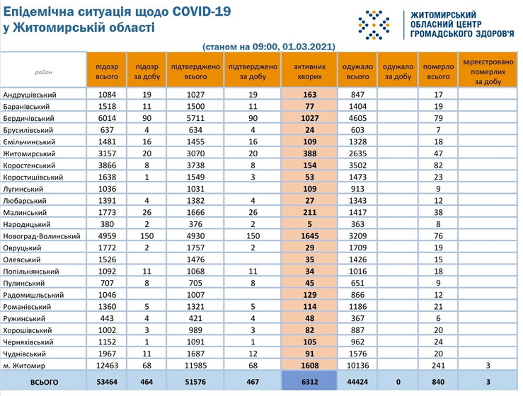 Станом на 09:00 год. 1 березня 2021 року в Житомирській області лабораторно підтвердили 51 576 випадків коронавірусної хвороби. За минулу добу, 28 лютого, було зареєстровано 467 нових випадків COVID-19. За період пандемії від ускладнень хвороби померли 840 пацієнтів, у тому числі минулої доби зафіксували 3 летальні випадки. Одужало загалом 44424 особи.