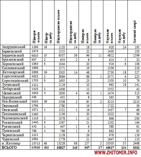 Станом на 09:00 год. 10 березня 2021 року в Житомирській області лабораторно підтвердили 55827 випадків коронавірусної хвороби. За минулу добу, 9 березня, було зареєстровано 145 нових випадків COVID-19. За період пандемії від ускладнень хвороби померло 907 пацієнтів, у тому числі минулої доби зафіксували 17 летальних випадків. Одужало загалом 45617 осіб.
