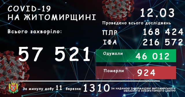 Як повідомляв Житомир.info, станом на 09:00 год. 11 березня 2021 року в Житомирській області за добу, 10 березня, було зареєстровано 384 нових випадків COVID-19. За період пандемії від ускладнень хвороби померло 918 пацієнтів, у тому числі минулої доби зафіксували 11 летальних випадків. Одужало загалом 45858 осіб.