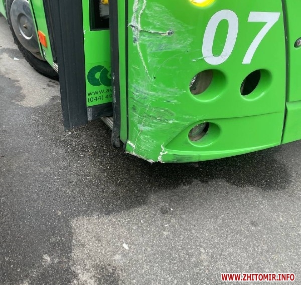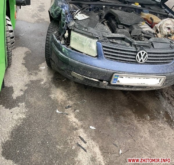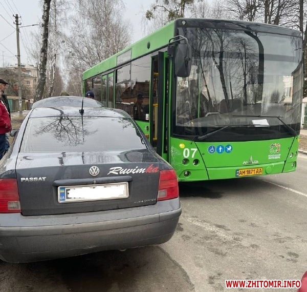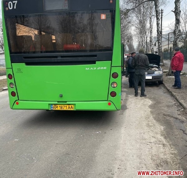 У Житомирі 14 березня сталася дорожньо-транспортна пригода за участю комунального автобуса МАЗ, що слідував за маршрутом №4, та автомобіля Volkswagen.