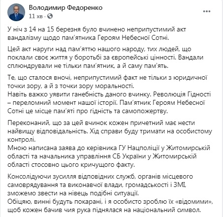 Те, що сталося вночі, неприпустимий факт не тільки з юридичної точки зору, а й з точки зору моральності. Навіть важко уявити ганебність даного вчинку. Революція Гідності – переломний момент нашої історії. Пам’ятник Героям Небесної Сотні це місце пам’яті про гідність та самопожертву. Переконаний, що за цей вчинок кожен причетний має нести найвищу відповідальність. Хід справи буду тримати на особистому контролі. Мною написана заява до керівника ГУ Нацполіції у Житомирській області та начальника управління СБ України у Житомирській області стосовно цього кричущого факту. Консолідуючи зусилля відповідних служб, органів місцевого самоврядування та виконавчої влади, громадськості і ЗМІ, зможемо звести на нівець подібні ситуації. Обіцяю, винні будуть покарані, і я особисто зроблю їх «відомими», щоб кожен бачив чия рука піднялася на національний символ», – написав Федоренко.