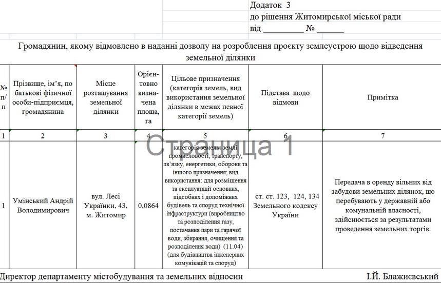 Депутат Житомирської міської ради Андрій Умінський (фракція партії «Пропозиція») купує 0,0235 га землі під придбаним на аукціоні будинком на вул. Лесі Українки, 43.