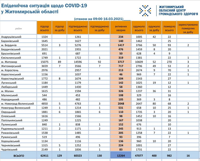 Станом на 09:00 год. 16 березня 2021 року в Житомирській області лабораторно підтвердили 60193 випадки коронавірусної хвороби. За минулу добу, 15 березня, було зареєстровано 130 нових випадків COVID-19. За період пандемії від ускладнень хвороби померло 982 пацієнти, у тому числі минулої доби зафіксували 16 летальних випадків. Одужало загалом 47077 осіб.