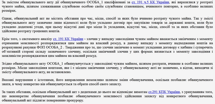 «За змістом обвинувального акту дії обвинуваченого ОСОБА_1 кваліфіковані за ст. 191 ч.5 КК України, які виразилися у розтраті чужого майна, шляхом зловживання службовою особою своїм службовим становищем, вчиненого повторно, в особливо великих розмірах. Однак, обвинувальний акт не містить обставин про час, місце, спосіб за яких було вчинено розтрату чужого майна. Так у змісті обвинувального акту зазначено лише відомості коли було укладено договір про закупівлю товарів за державні кошти, коли було укладено додаткові угоди, при цьому відсутні дані про місце їх укладення, відсутні час, місце, спосіб та за яких обставин було здійснено розтрату грошових коштів», - зазначається в ухвалі суду.