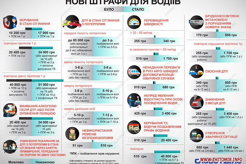 З 17 березня 2021 року в України збільшили штрафи за низку порушень правил дорожнього руху. Закон Верховна рада ухвалила ще у лютому цього року, він посилює відповідальність, зокрема, за водіння у нетверезому стані, перевищення швидкості, скоєння ДТП, керування без посвідчення водія.