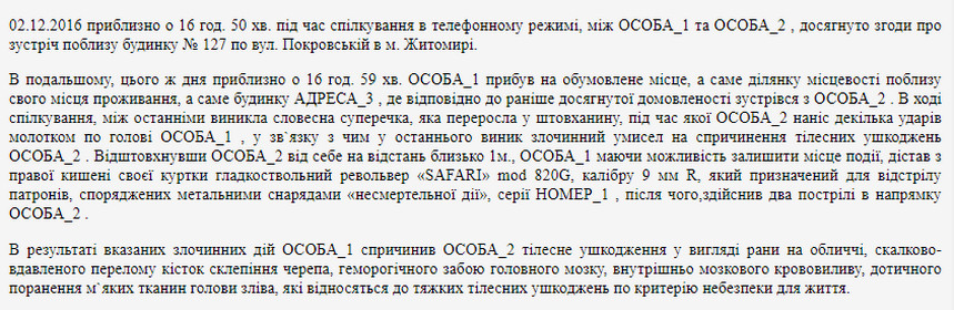 Як повідомляв Житомир.info, 2 грудня 2016 у Житомирі близько 17.00 на вулиці Крошенській поранили чоловіка. Поліція встановила, що під час конфлікту між двома раніше судимими чоловіками, один з них вистрелив з пристрою для відстрілу гумових куль і попав опоненту в голову. Потерпілий потрапив до реанімації, за кілька днів він вийшов з коми, однак гумову кулю лікарям не вдалося дістати, оскільки це було небезпечно для пацієнта.