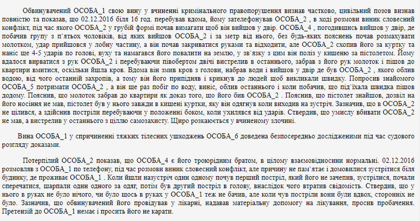 Потерпілий же запевняв, що під час штовханини в руках у нього нічого не було, а після пострілу – втратив свідомість – тож нічого не пам’ятає. Проте у обвинуваченого були зафіксовані травми на обличчі та голові, спричинені тупим предметом, а також виявлені сліди крові у під’їзді, куди заходив лише обвинувачений.