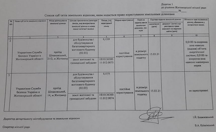 Як повідомляв Житомир.info, свого часу управління СБУ в Житомирській області отримало земельну ділянку площею 1,1238 га по вул.Синельниківська,14 (біля центрального стадіону «Полісся» в парку), де весною 2016 році почали зводити багатоповерхівку, а в березні 2017 року вже вручали сертифікати на квартири співробітникам СБУ.
