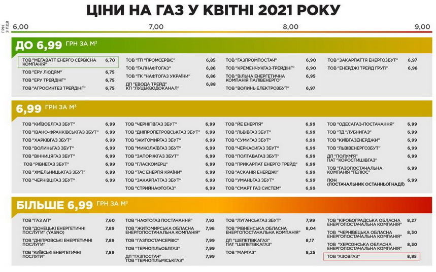 Водночас сайт «ГазПравда» оприлюднив ціни на газ для населення у квітні від більш ніж півсотні різних постачальників: 14 матимуть ціну нижчу 6,99, зокрема ГК «Нафтогаз України» - 6,86 грн; 33 компанії, в тому числі й «Житомиргаз Збут», тримають ціну 6,99 грн; 17 виставили ціну від 7,60 грн до 8,85 грн (ТОВ «Азовгаз»).