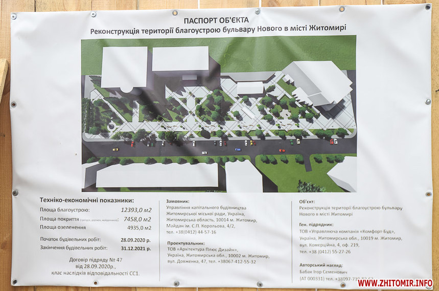 1 жовтня 2020 року в Житомирі розпочались підготовчі роботи з реалізації проєкту реконструкції, почали демонтаж старого покриття на Новому бульварі. Також підрядник почав зрізати старі дерева та кущі, видалення яких попередньо погодив виконавчий комітет. На ділянці з 15 жовтня працювали археологи, які проводили нагляд під час земляних робіт.