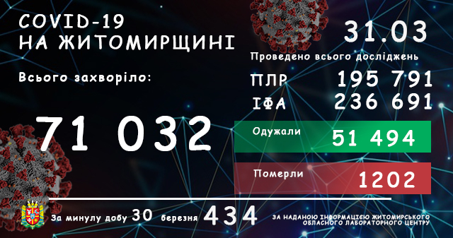 Станом на 9:00 год. 31 березня 2021 року в Житомирській області лабораторно підтвердили 71032 випадки коронавірусної хвороби. За минулу добу, 30 березня, було зареєстровано 434 нових інфікування COVID-19. За період пандемії від ускладнень хвороби померли 1202 пацієнти (24 – за минулу добу). Всього одужали 51494 жителі області, нині активних хворих – 18336 осіб.