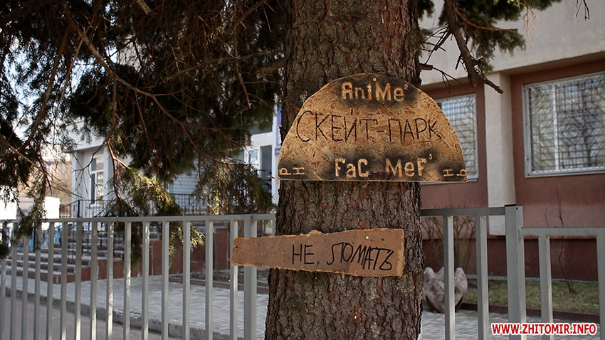Житомирські райдери не дочекалися відкриття і вже тренуються у скейт-парку: самостійно повісили табличку та зробили грайндбокс з дерев’яних піддонів.